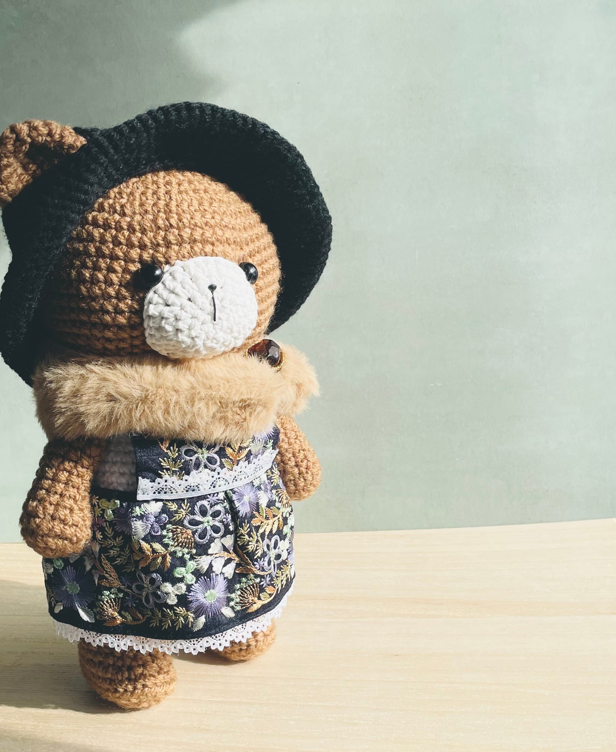 刺繍が可愛いスカートでちょっとゴージャスにオシャレをしたくまちゃんです